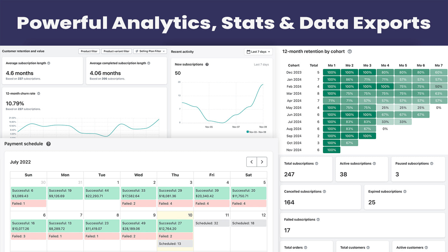 PayWhirl offers a robust suite of analytics and statistics designed to help businesses effectively manage and optimize their subscription operations. From tracking customer retention and churn rates to understanding average subscription lengths and revenue trends, PayWhirl equips merchants with the insights they need to make data-driven decisions.