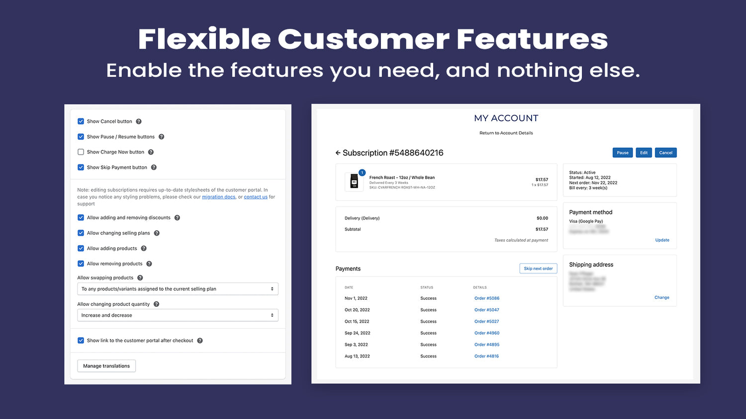 Save payment methods and offer new payment options to your customers. Allow customers to manage and customize subscriptions on their own.