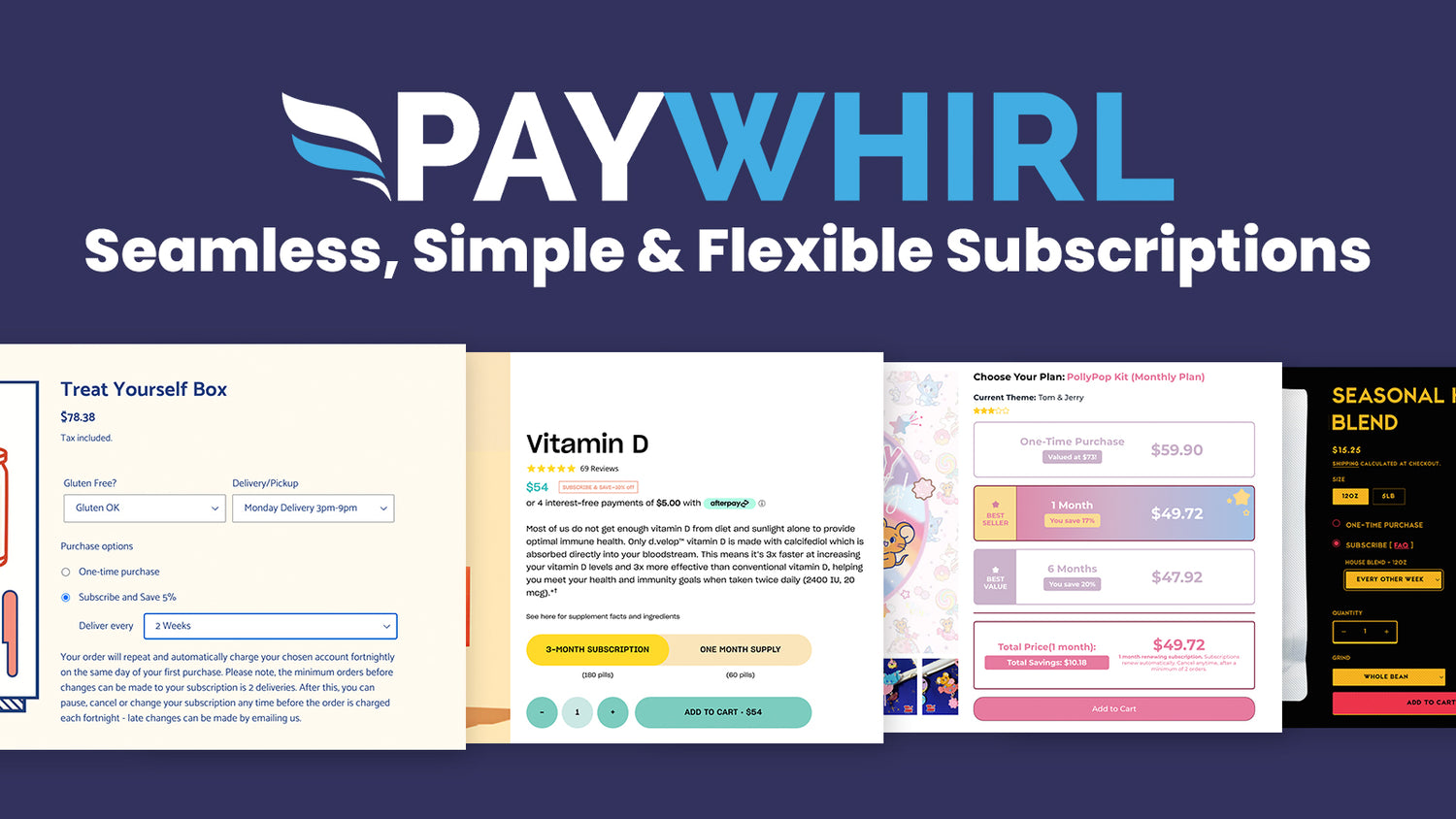"Simple to use app that has helped keep my customers returning. Customers find updating their subscription easy and PayWhirl have even designed a cancellation flow (which most organisation try pretend don't exist!). My customers love the consistency in their orders, the flexibility available in their plans, and of course the ability to save money. PayWhirl support has been incredibly helpful when needed and are very responsive. Fantastic app. Paid for itself many times over"