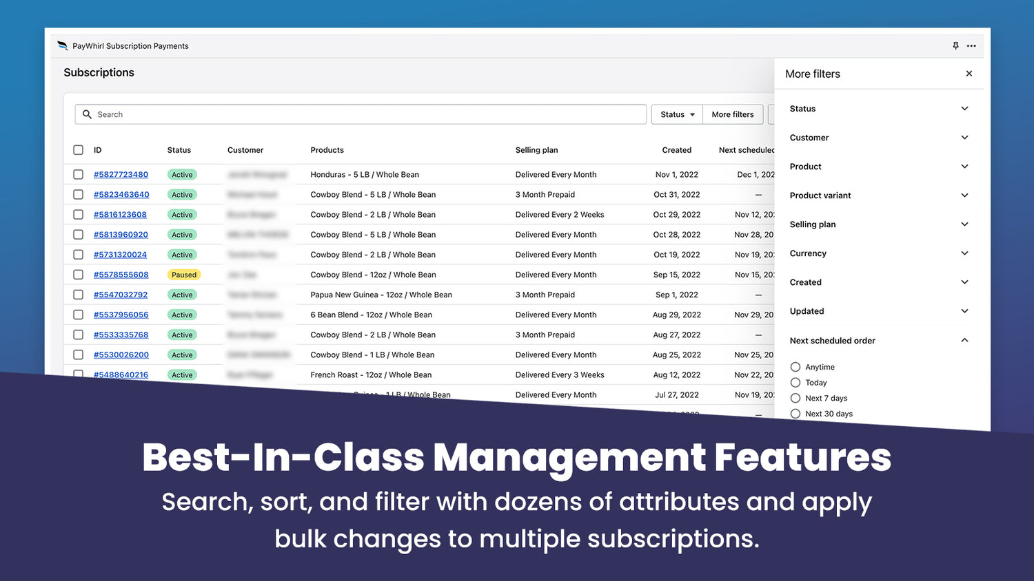 PayWhirl provides everything you need to manage subscriptions with ease, offering powerful bulk actions, advanced search, and sorting capabilities. Whether you're making updates across multiple subscriptions or finding specific customer details, PayWhirl streamlines subscription management, saving you time and effort. Managing your subscription program has never been more efficient!